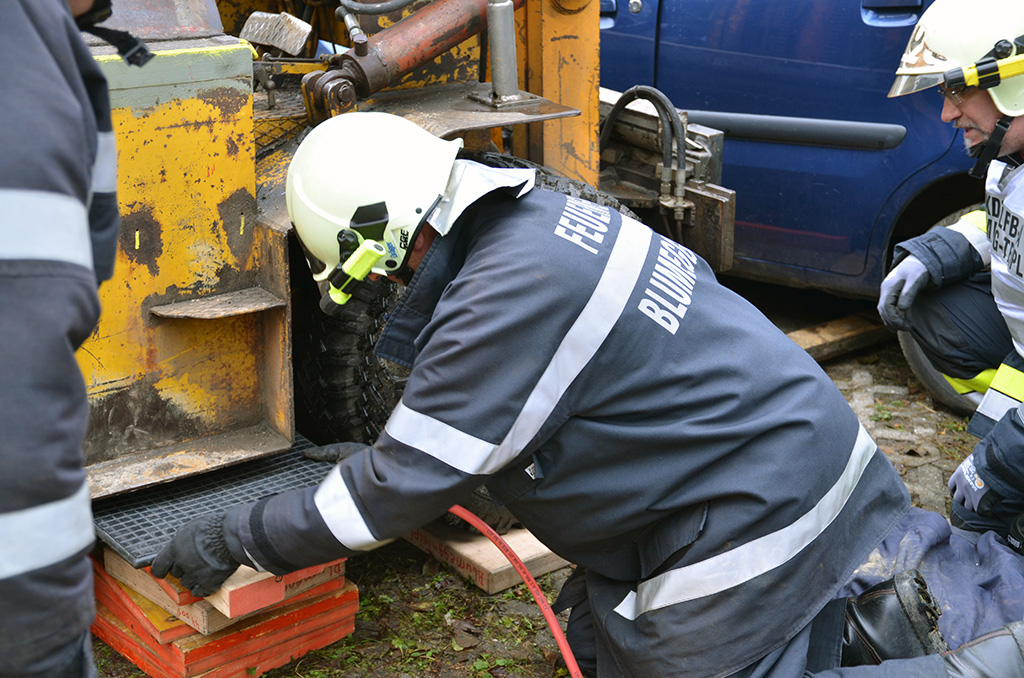 Die teilnehmenden Kameraden wurden auf drei Gruppen aufgeteilt und begannen sogleich mit ihren Aufträgen. Mit der Tragkraftspritze wurde vom nahen Löschteich angesaugt und mit Hilfe des Zumischers in der Löschleitung der Löschangriff mit Schaumrohr durchgeführt. Währenddessen war auch schon das Hebekissen vorbereitet und die Menschenrettung konnte zügig erledigt werden.