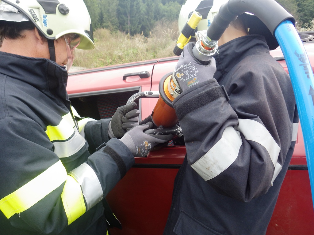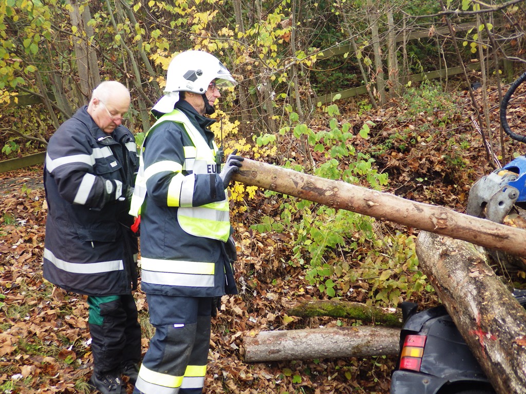 Nach einer kurzen Vorbesprechung im Rüsthaus ging es dann los. Der eingeteilte Übungsleiter Wolfgang Sackl hatte alle Hände voll zu tun. In erster Linie wurde die Strasse für den Verkehr gesperrt und die Einsatzstelle abgesichert. Nebenbei wurde ein Brandschutz aufgebaut. Nachdem das Fahrzeug durch das Holz nicht zugänglich war,wurde zuerst mit der Entfernung der Baumstämme begonnen. Hierbei wurde auch die Handhabung der Motorsägen geübt und erklärt. Danach konnte mit der Rettung der verunfallten Person begonnen werden. Hierzu wurde mit dem hydraulischen Rettungsgerät ein Zugang in das Fahrzeug geschaffen. Die Person konnte so befreit und gerettet werden. Diese wurde mit der Schaufeltrage abtransportiert. Hier konnte auch der Umgang mit der Schaufeltrage geübt werden.