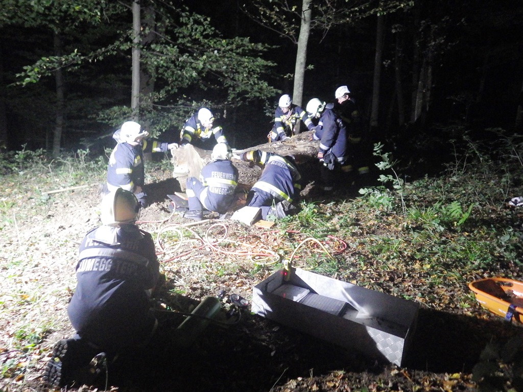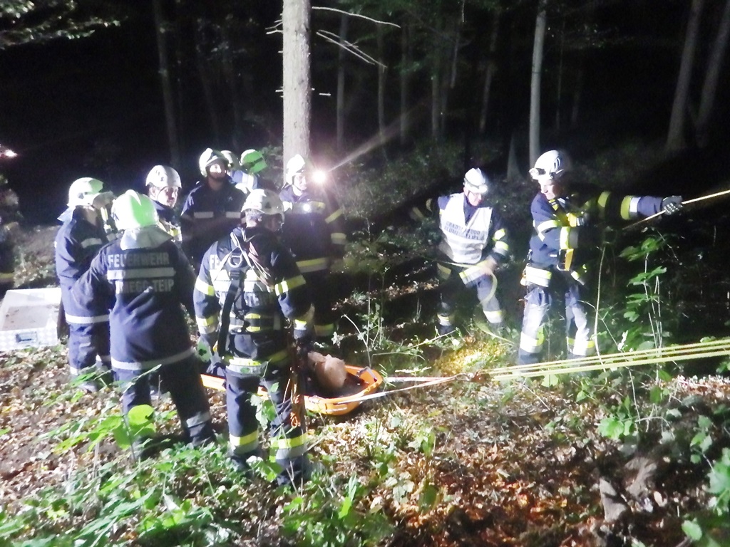 Am 06.10.2017 fand in den Abendstunden die Monatsübung für Oktober statt. Ausgearbeitet wurde diese von LM PICHLER Gernot mit folgendem Einsatzszenario. In der Dämmerung ereignete sich im Zuge von Forstarbeiten ein schwerer Forstunfall in unwegsamem Gelände, wobei der Forstarbeiter unter einem Bloch Holz eingeklemmt wurde. An der Übungsstelle angekommen, erkundete Übungsleiter HBM ROBOSCH Herbert den Unfallort. Es wurden sofort zwei Sanitäter für die Erstversorgung des Verletzten eingeteilt. Die Ausleuchtung des Zugangs der Unfallstelle wurde mit den eingebauten Scheinwerfern des LFB-As durchgeführt. Der unmittelbare Übungsort wurde mit Stativscheinwerfern beleuchtet, welche mittels Notstromaggregat betrieben wurden. Am steilen Zugang im Waldgelände zur Unfallstelle wurde ein Seilzug angebracht, zum einen um die benötigten Gerätschaften dort hin zu bringen und zum anderen, um die Kameraden zu sichern. Das Bloch Holz konnte mit Hilfe des Hebekissens schnell angehoben und die verletzte Person gerettet werden. Diese wurde in der Korbtrage fixiert und vom MRAS-Team über den Seilzug aus dem unwegsamen Gelände gebracht. Nach der Versorgung der Geräte wurde in einem gemütlichen Rahmen die Übung nachbesprochen.