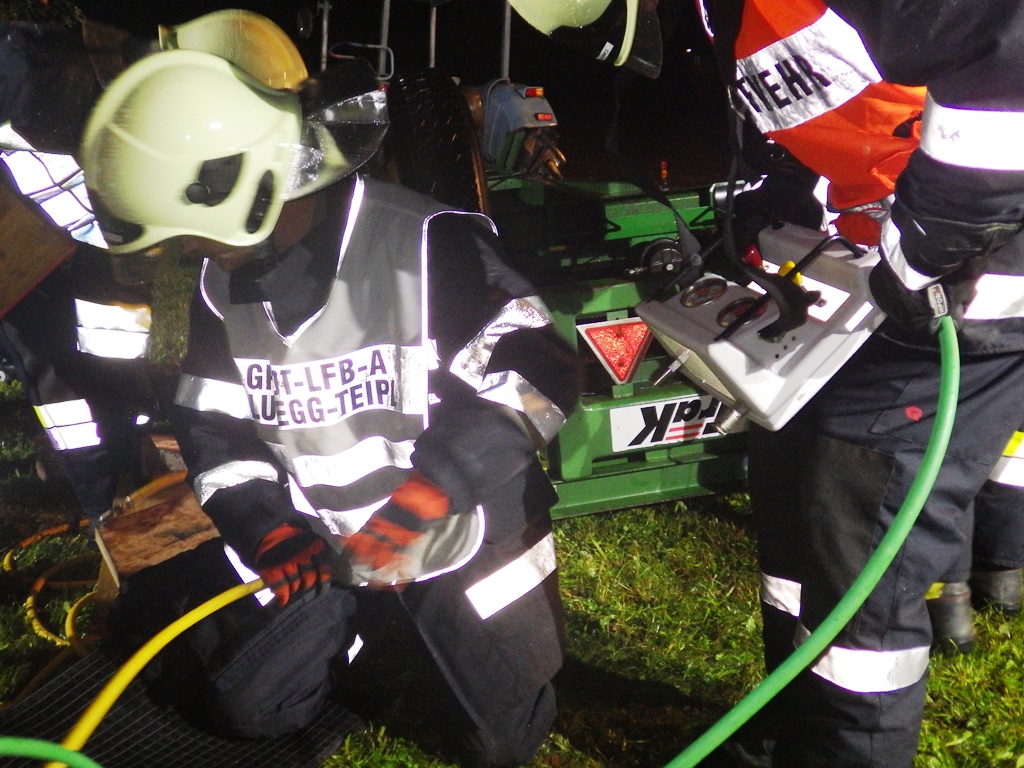 Am 07. Oktober 2016 fand eine Monatsübung beim Anwesen Hofgartner in der Oberblumeggstraße statt. Die Übungsalarmierung lautete: landwirtschaftlicher Arbeitsunfall, wobei ein Anhänger umgekippt und eine Person von diesem eingeklemmt worden ist. Nachdem die Gemeindestraße abgesichert und die Beleuchtung aufgebaut war, ging es sofort an die Menschenrettung. Mittels Südbahnwinde und pneumatischen Hebekissen konnte die verletzte Person schnell und schonend gerettet werden. Um den Anhänger wieder in die ursprüngliche Position zu bringen, wurde auf der einen Seite ein Greifzug aufgebaut und auf der anderen die hydraulische Seilwinde des LFB-A befestigt. Somit konnte der Anhänger rasch und ruckfrei aufgestellt werden.